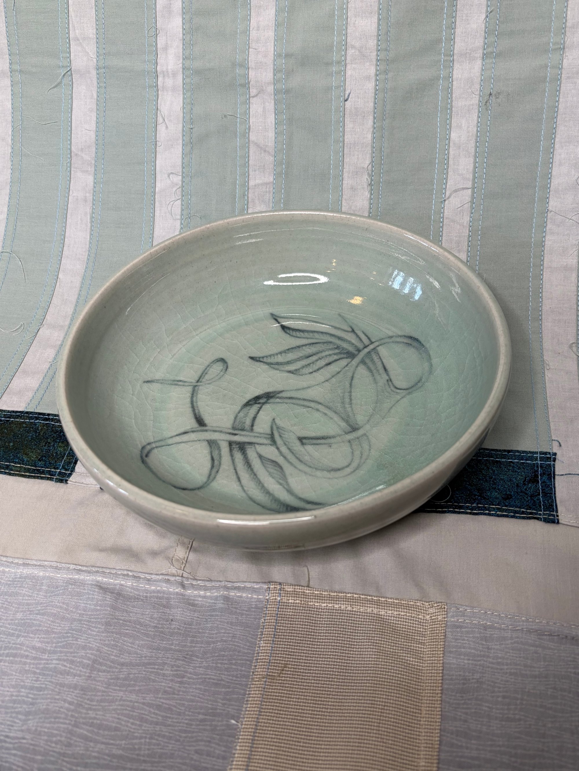 Diameter 7.75 in. x H 2 in. Light stoneware pasta bowl glazed in blue celadon with black underglaze painting 2 available, but priced individually.