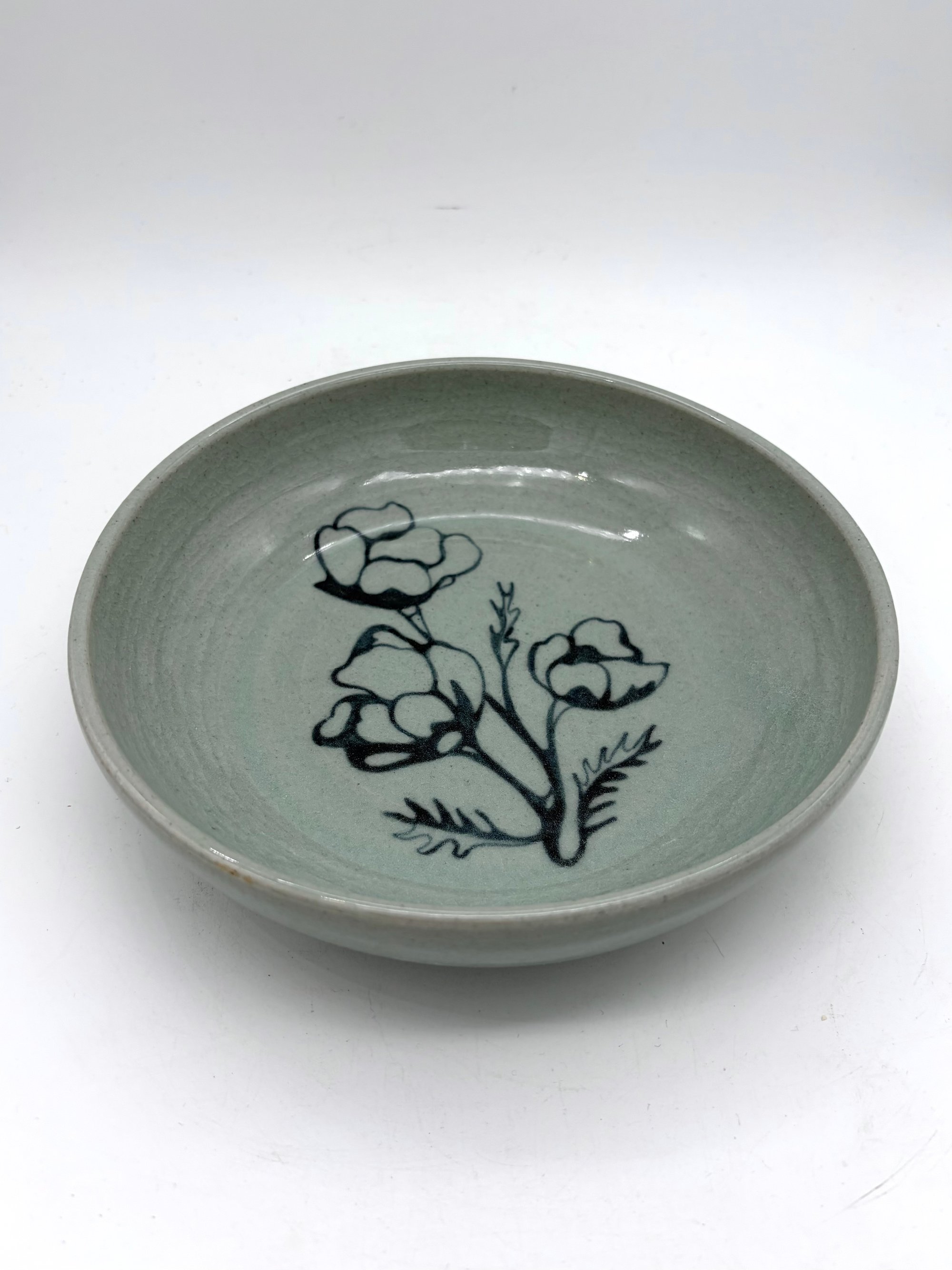 Diameter 7.5 in. x H 2 in. Light stoneware pasta bowl glazed in blue celadon with black underglaze painting 1 available