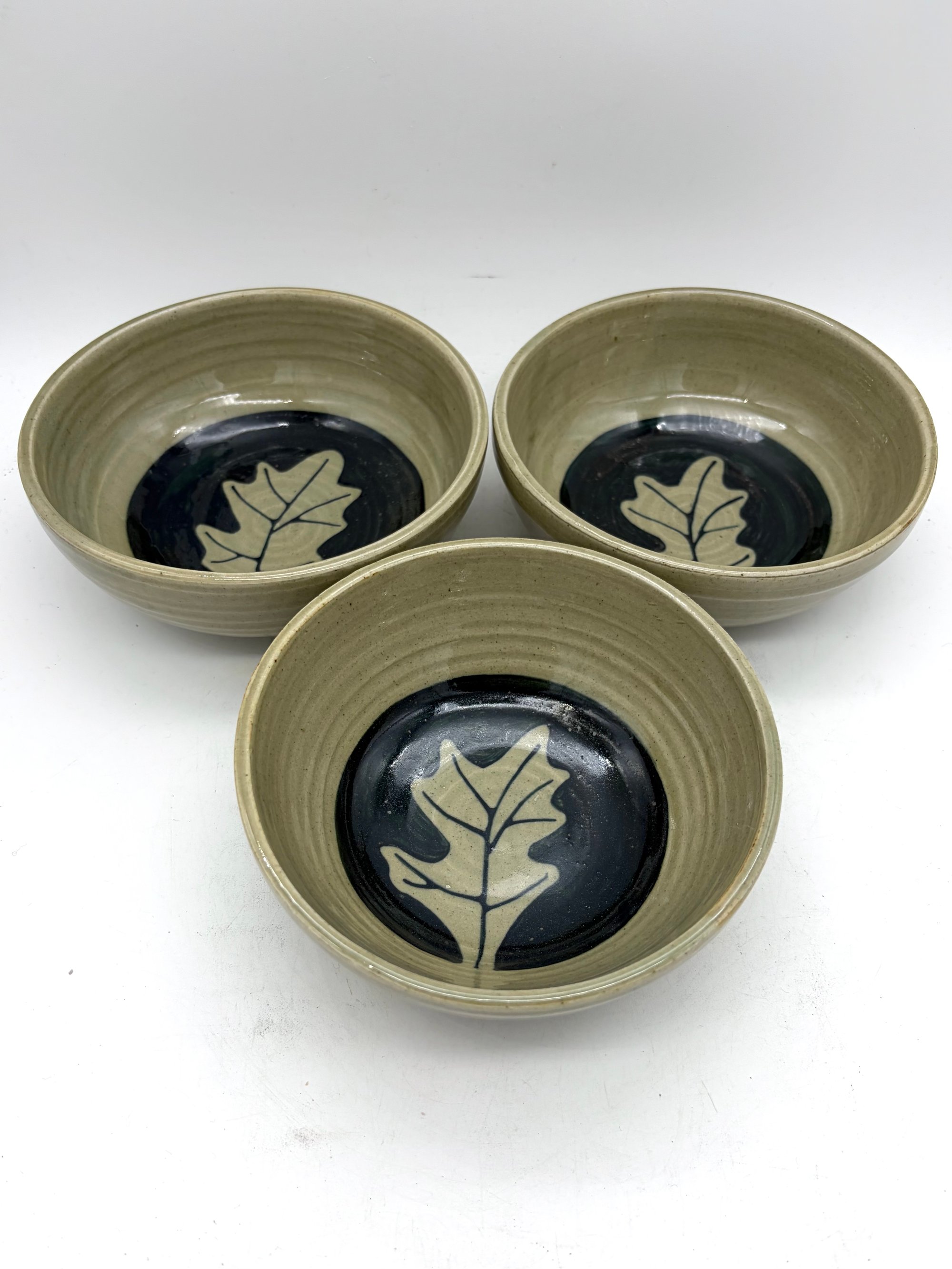 diameter 5.5in. x 2in. Light small bowl glazed in green celadon with black slip painting 3 available, but priced individually.